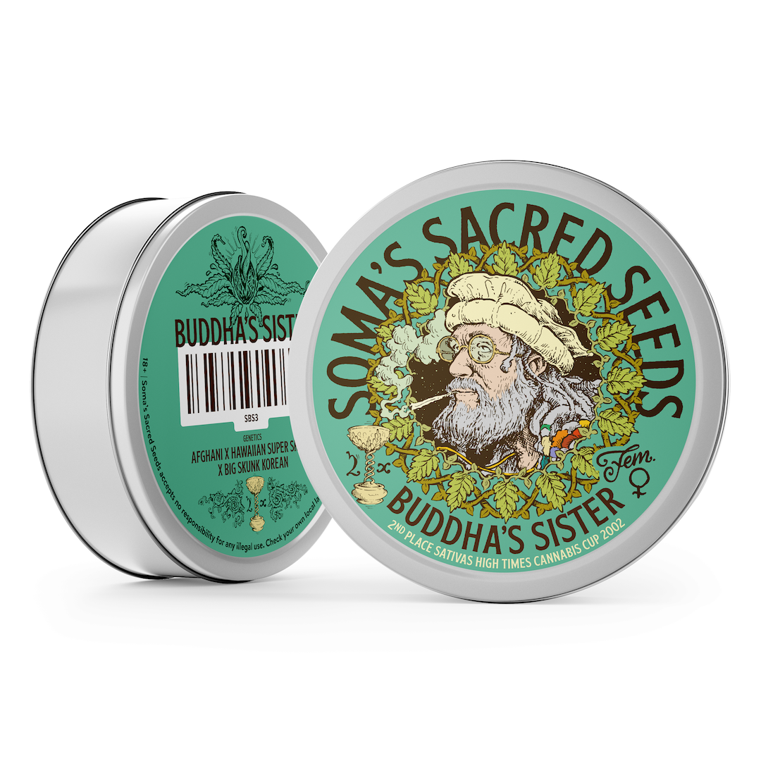 Previously called Soma Skunk V+, this variety was renamed Buddha’s sister to suit her tendencies and advance her appeal to Amsterdam coffeeshops. What’s in a name? Directly after this deliciously good weed acquired a more intriguing name, she regularly sold out at the coffeeshops, and remains one of the best selling weeds available at De Dampkring. This sibling of Siddhartha is tall and lanky. In the cross with Afghani Hawaiian, she has a considerably increased yield, but less sweet taste than her other half, the Reclining Buddha. Buddha’s sister has a flavor like a tart cherry candy, and the scent is similarly tart rather than sweet. The buds have a slippery, silky feel, which means an abundance of greasy resin to make into fantastic hash. She even gives a lot of finger hash that you won’t want to wash away after grooming plants. As with all of Soma’s varieties, Buddha’s sister is medicinal quality cannabis, therapeutic for many conditions. The high is powerful, creative and cerebral in its effects. A mostly indica variety, Buddha’s sister tends to make lots of side branches, so she is better to grow as a multi-branch plant instead of in a sea of green. She will still thrive using a sea of green method with some attentiveness. This variety does well hydroponically, but Soma’s totally organic soil methods also deliver great results. The more fluffy, loosely packed buds give this plant a resistance to mold while still delivering a pleasing yield.