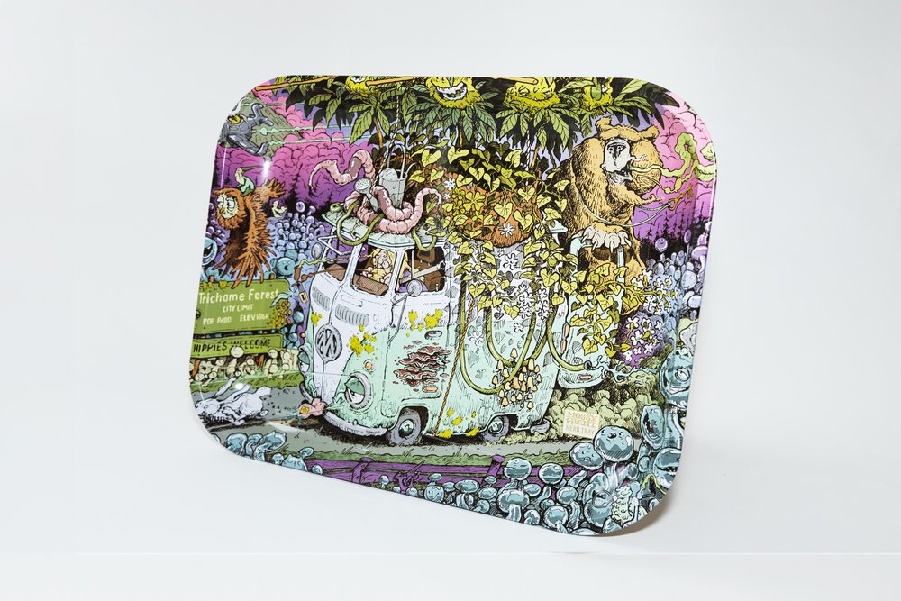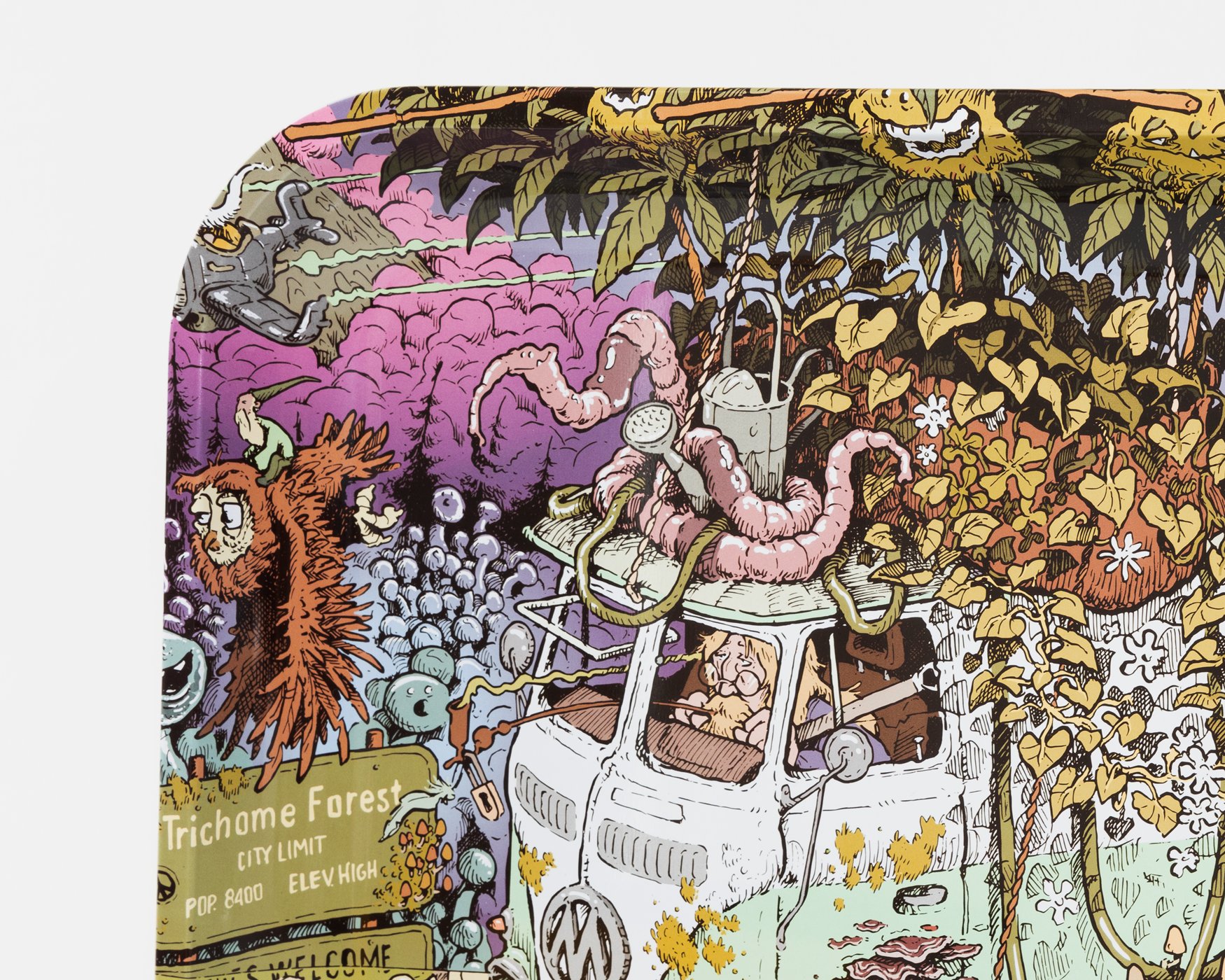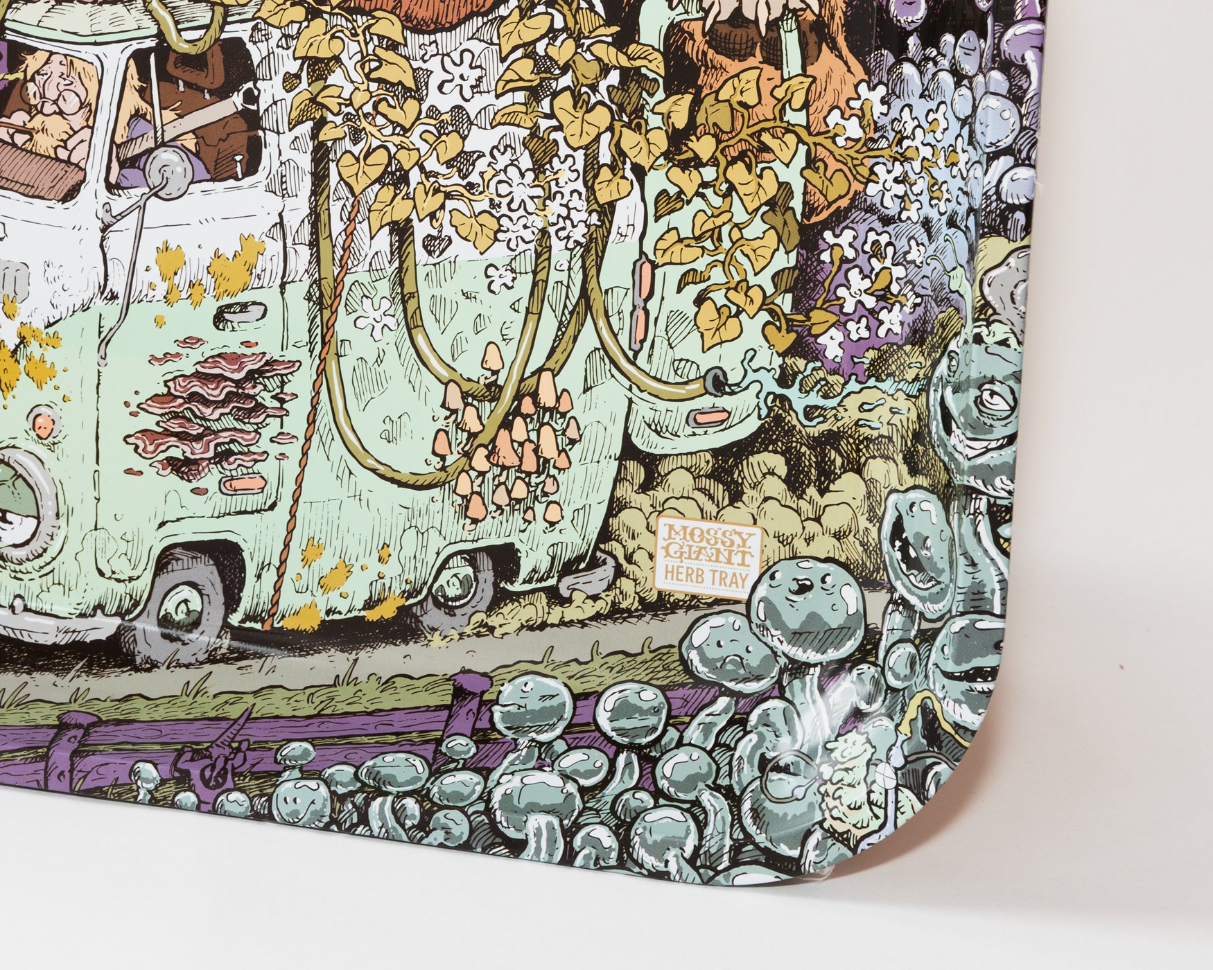 Huge Mossy Giant Metal Rolling Tray for rolling and preparing all your finest herbs. Showcasing the ever slow moving hippie and bear on another wild adventure to the deep Trichome Forest.