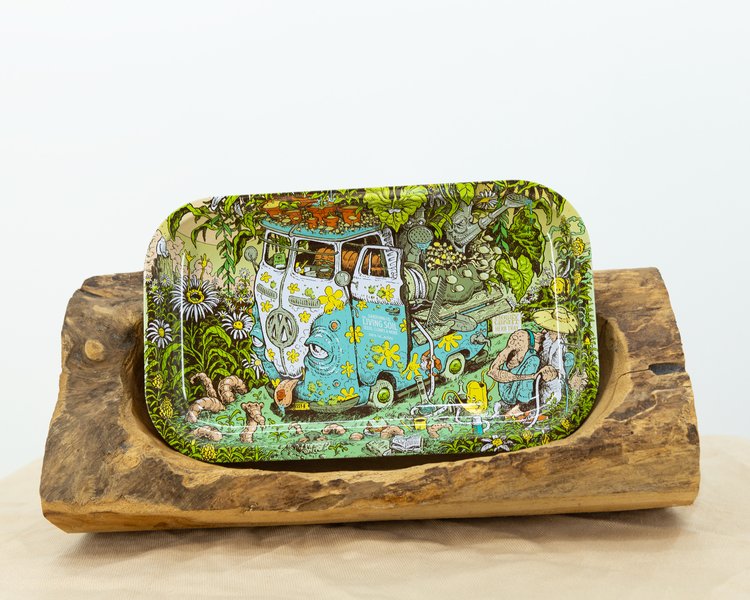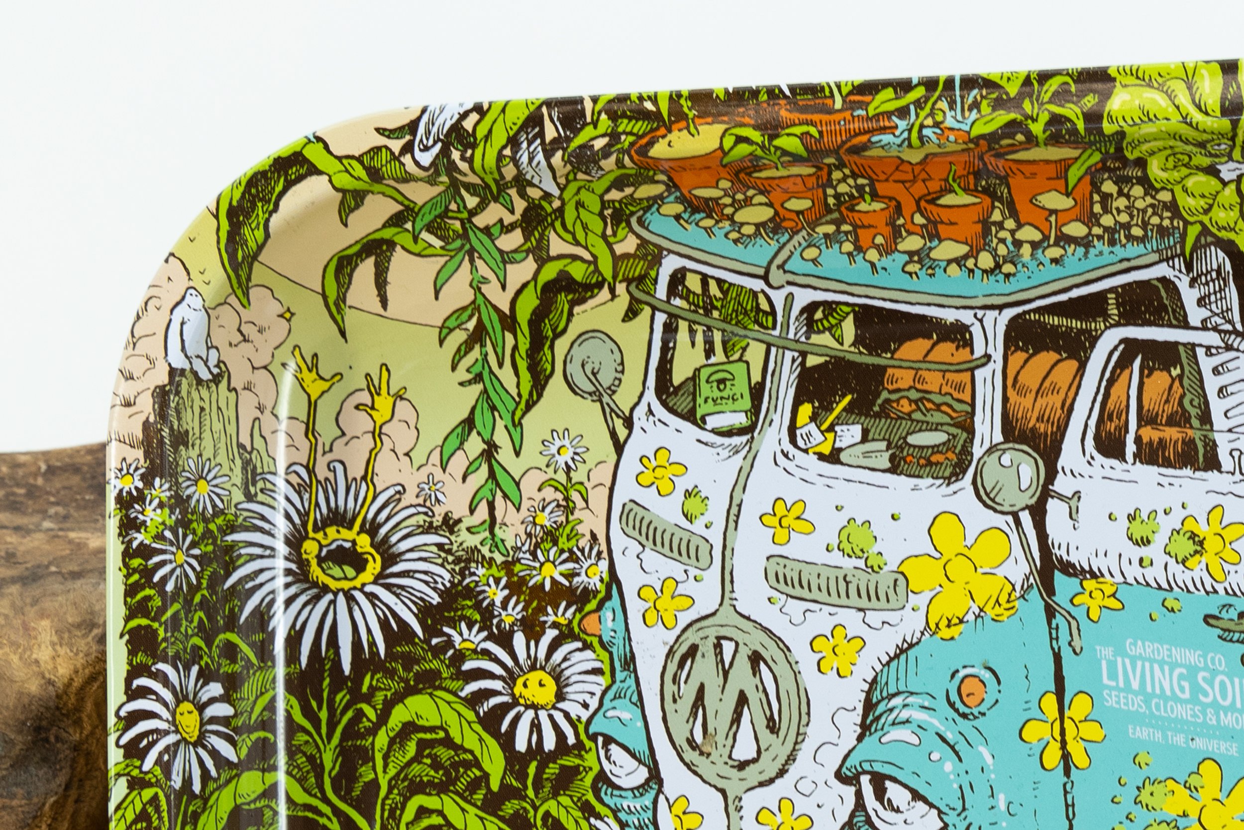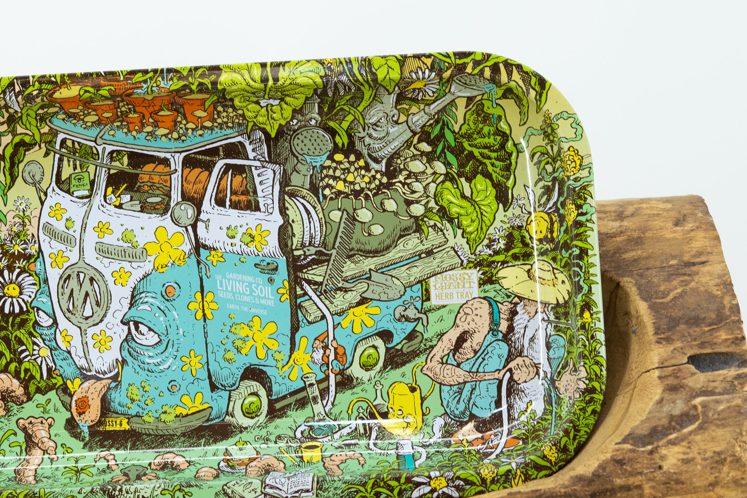 Mossy Giant Metal Rolling Tray for rolling and preparing all your finest herbs. Showcasing the gardener tending to his giant garden whilst his trusted van is patiently waiting for the journey to commence.