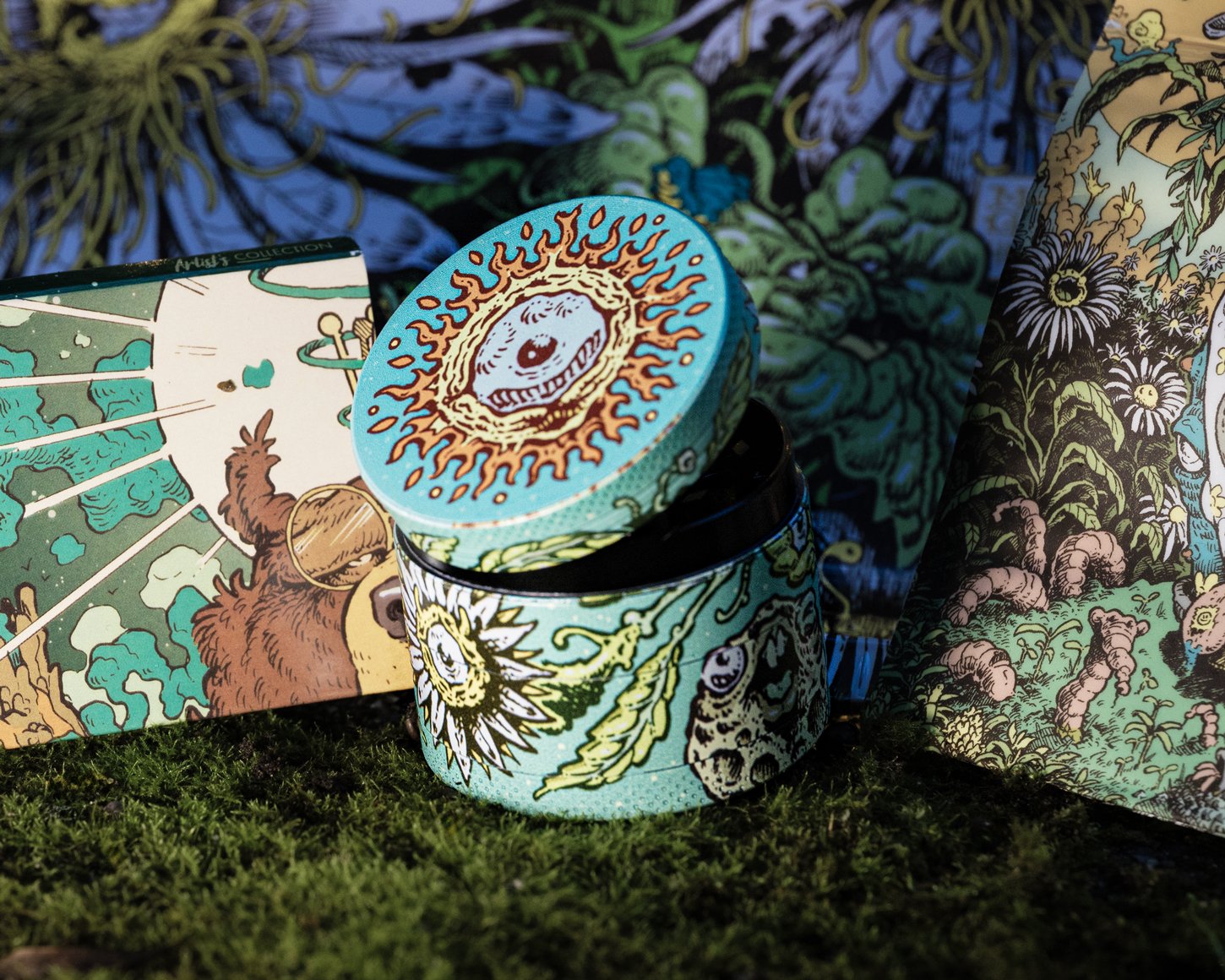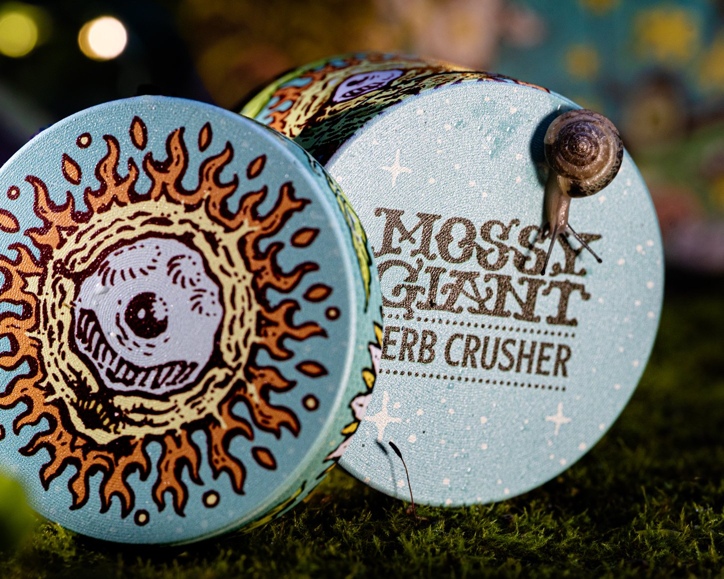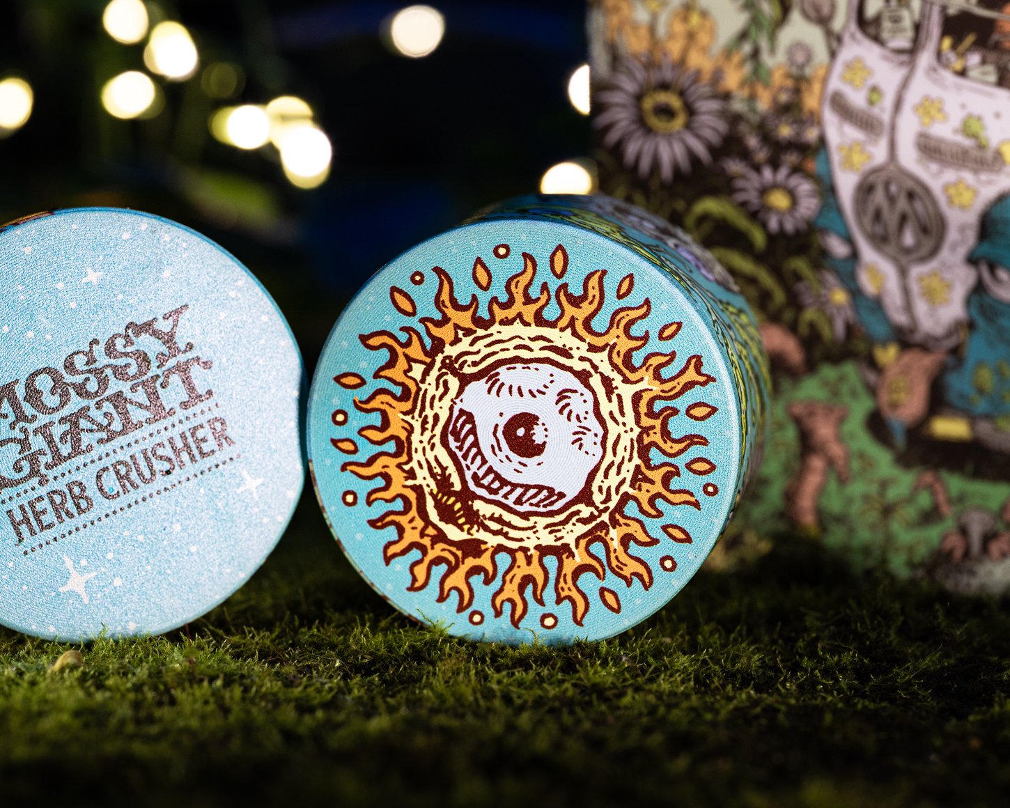 Grind your herb in style with the first ever Mossy Giant “Herb Crusher”. This 4 compartment 44mm diamater zinc herb grinder will take of grinding your herb while doing it in style. Adorned by our all life giving sun the plants grow all around the container. feel heavy in the hand and made of solid materials.
