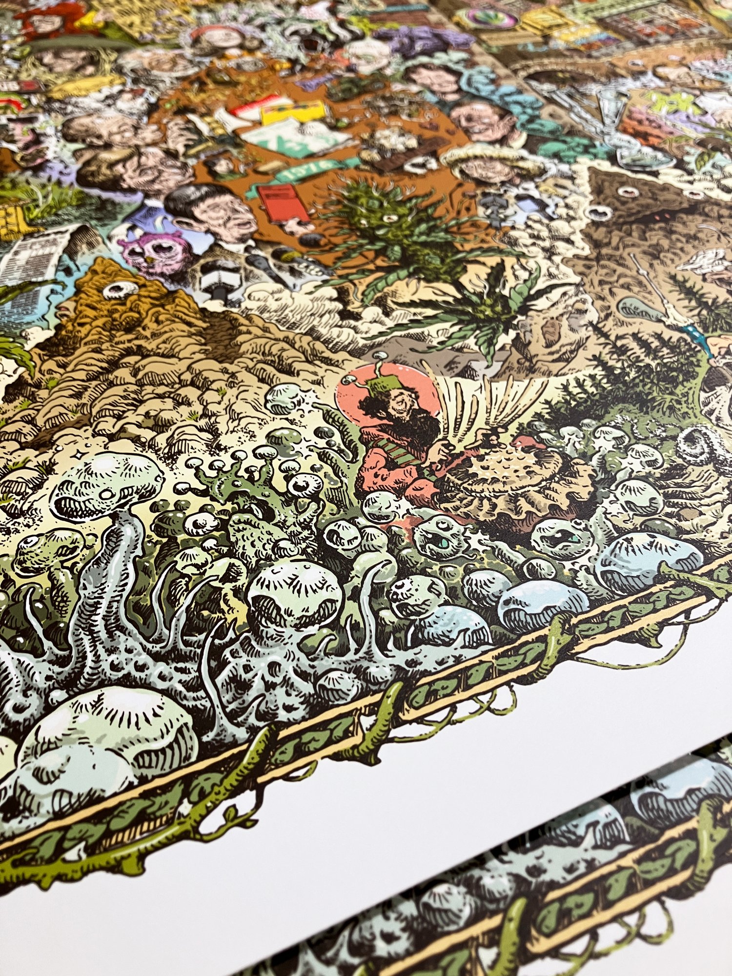 A piece for the ages and a true collectors must-have. Top quality fine art print 112cm x 66cm (44” x 26”) limited edition BIG (88 signed & numbered) offset print. 300 grams paper. This artwork is made in collaboration with Spanish social-club La Creme Gracia, a local boutique social club that serves it members top notch homegrown medicine and a living room vibe. This installation is now permanently on display in Barcelona Spain.