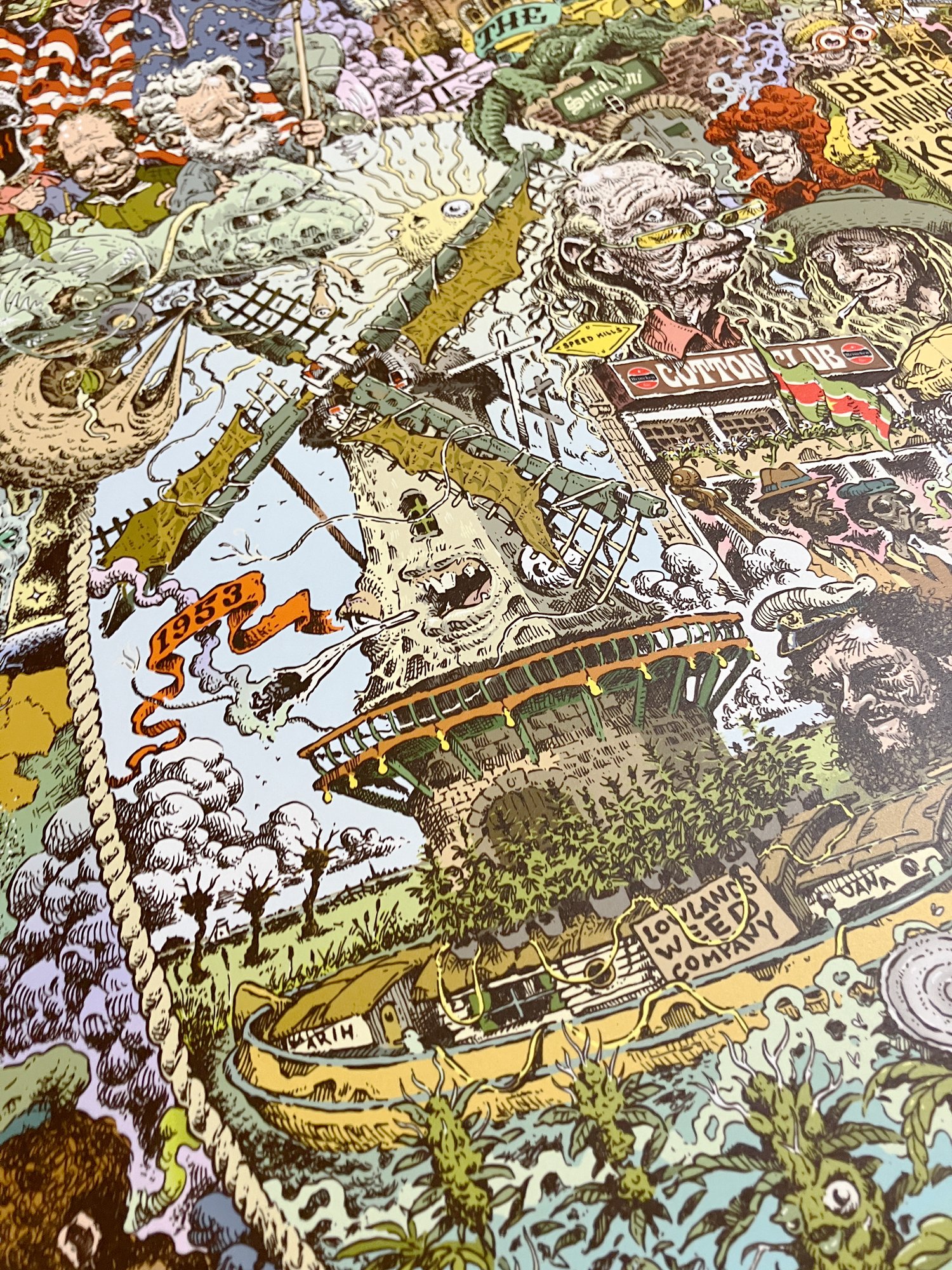 The artwork depicts a short but turbulent time in Netherlands – from about the 60s until the late 2000s the Netherlands were the epi-center of what was cannabis globally during that time. The laws that were created during the very liberal 70s opened the door for many cannabis refugees to come to Holland and together with the adventurous native Dutch they teamed up to work on their craft and lay the foundation for what is cannabis we know today – without this small liberal country cannabis would not be what it is today.